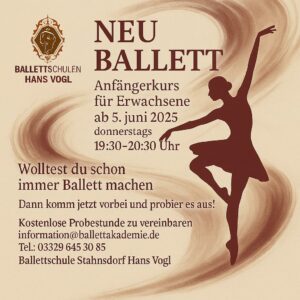 ab sofort startet unser neuer Kurs BALLETT FÜR ERWACHSENE ANFÄNGER in unserer Ballettschule in Stahnsdorf.