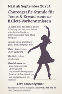 ab 11. September 2025 startet unser neuer Kurs "Choreografie für Teens & Erwachsene mit Ballett-Vorkenntnissen" in unserer Ballettschule am Mexikoplatz.